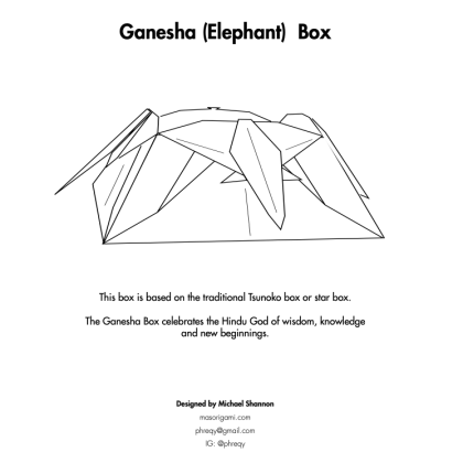 A variation of the traditional Star Box model where each flap is folded as an elephants head with tusks. The first model I ever designed and diagrammed many moons ago.