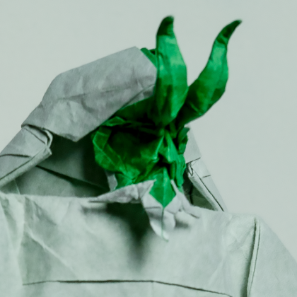I tried the head first, found a proportion to make the nice nose and was very fortunate to get the structure of the beard. Next in order to use a scale as large as possible to ensure the details of the head, I put three tails in three corners. Finally I made one with 46cm paper and another with 80cm paper.