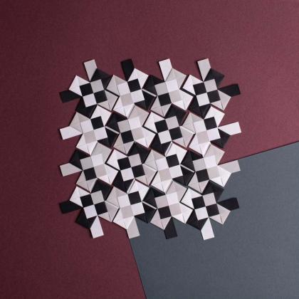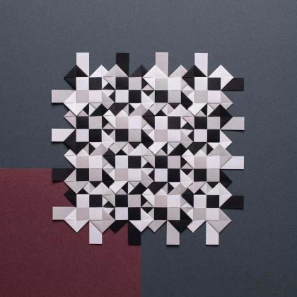 An origami quilt. Its interplay between white, gray, and white, gives it a more solemn atmosphere, and its different 45° and 90° squares reinforces the idea of a patchwork quilt. Quite beautiful without the need of overcomplicated details.