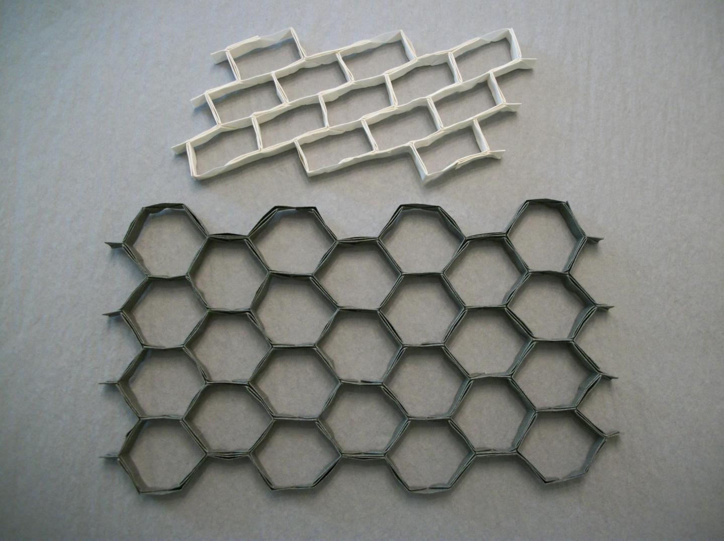 Return to EntriesI've been experimenting with the possibilities of incorporating single straight cuts with box-pleating for the past month. To design a crown, I found a good folding process to form the cavity from the cut which prevents further ripping. After testing out multiple such cavities on a single sheet, I noticed a pattern could be obtained. Epiphany ensued. Meet a new type of origami tessellation: the lattice. The two models you see are the exact same design, but with different shaping. Thanks to the flexibility provided by the links in the lattice, there are many more possibilities, including curves. Note: this is only the beginning. In less than two weeks, I came up with 10 different designs and that count will only go up as I attempt more complex patterns.